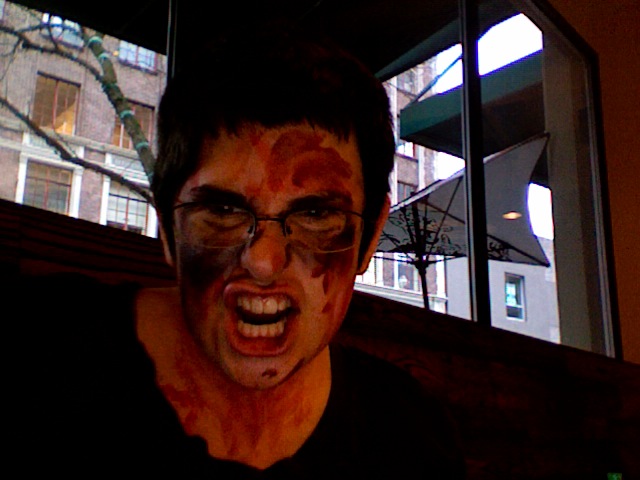 So after listening to Tamora Pierce discuss fantasy I got to test out life as a zombie! That’s right: a zombie. I happened to be downtown on the day that Portland was taken over by the undead (commonly known as the Zombie Walk). I didn’t plan on joining in but much to my surprise I recognized a handful of them and before I knew it my face was covered in blood and I was groaning in pain and limping like . . . a zombie.